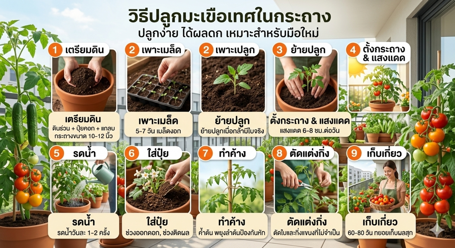 การปลูกมะเขือเทศในกระถางเป็นวิธีที่เหมาะสำหรับคนพื้นที่น้อย และมือใหม่ เพียงดูแลเรื่องดิน น้ำ แสงแดด และปุ๋ยให้เหมาะสม ก็สามารถปลูกมะเขือเทศให้ได้ผลดก เก็บกินเองหรือปลูกขายได้