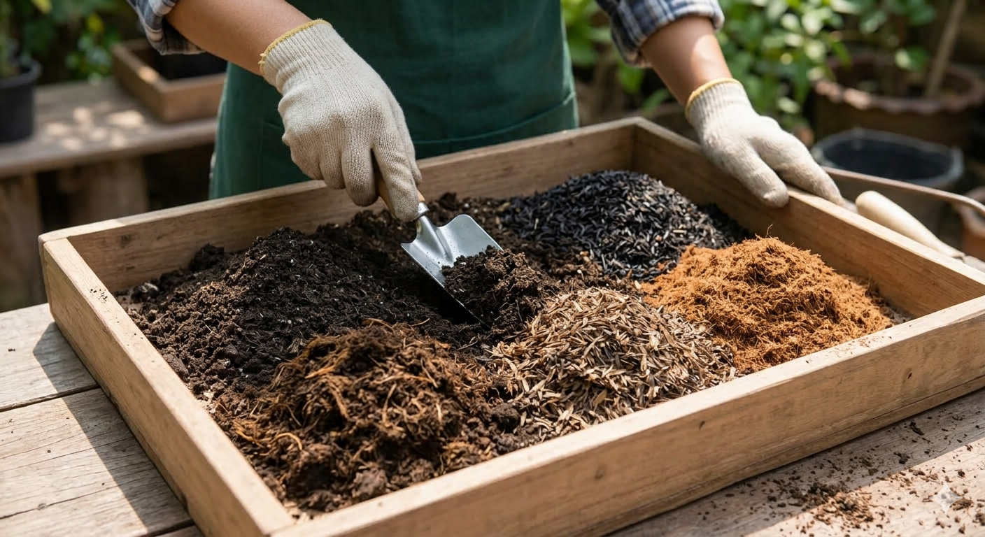 แกลบดำ หรือขุยมะพร้าว 1 ส่วน